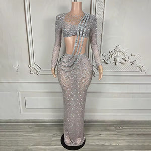 The top of this two-piece dress showcases a chic, cropped design with elegant long sleeves, providing a perfect blend of sophistication and allure. The high-waisted skirt hugs your curves, flowing gracefully to the floor for a glamorous silhouette. Ideal for proms, galas, or any upscale event, the Glistening Elegance Dress ensures that all eyes are on you.