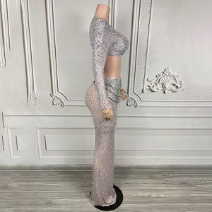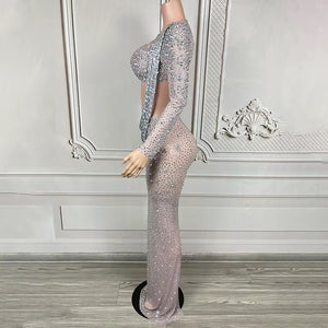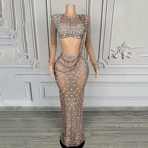 Elevate your wardrobe with the stunning Glistening Elegance Two-Piece Dress, designed to make you shine at any special occasion. This captivating outfit features a sparkling, intricately embellished long-sleeve top paired with a form-fitting skirt, both adorned with shimmering rhinestones that catch the light beautifully.