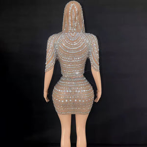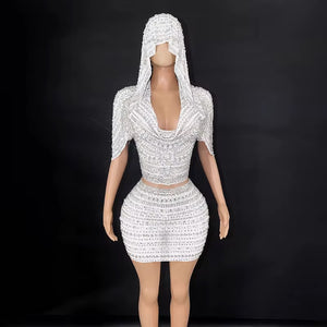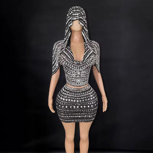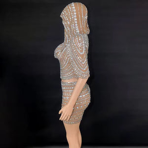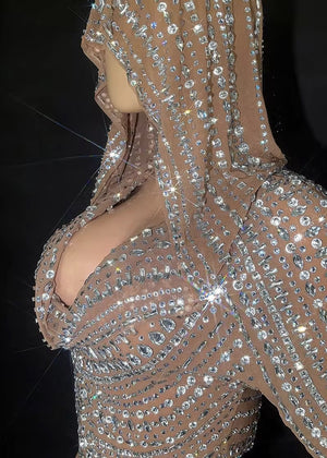 Step into the spotlight with the stunning Regal Allure Two-Piece Ensemble, designed to make a lasting impression. This outfit features a nude illusion base beautifully embellished with shimmering silver rhinestones, exuding elegance and sophistication.