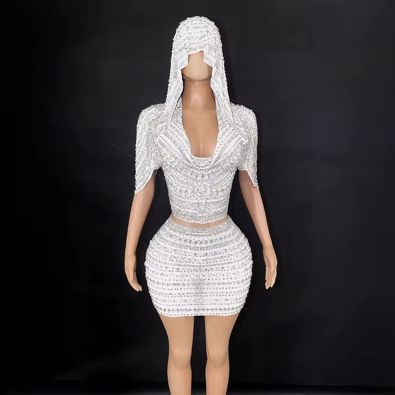 - Design: The ensemble includes a stylish hooded mini skirt paired with a draped cowl neckline top, creating a regal and sophisticated silhouette.